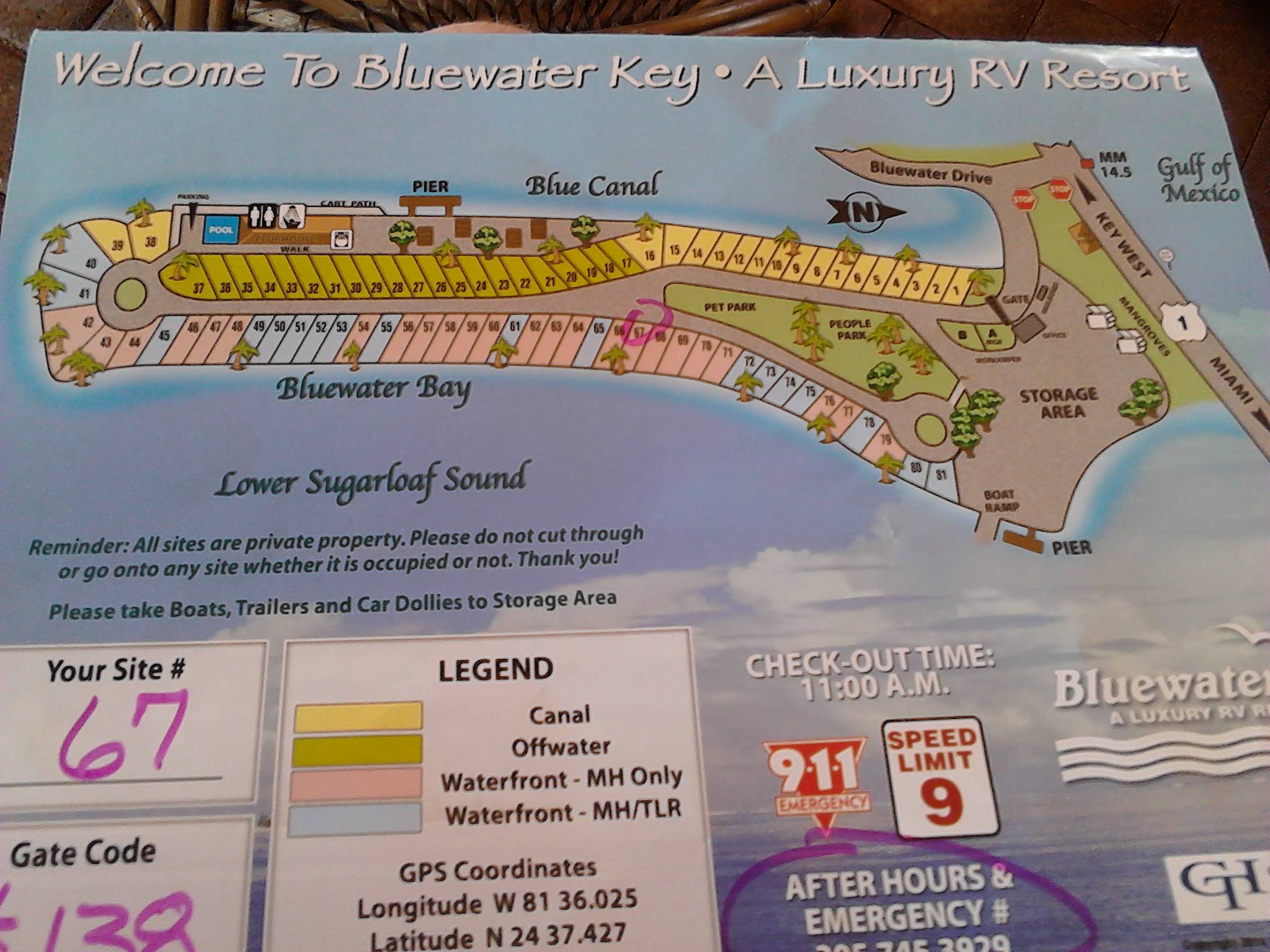 It didn’t take long, just over 2 hours, what with the slow speed limits on long stretches (35 & 45 mph) and then we crossed the last bridge, saw the Mile-Marker 14.5 and turned left into Blue Water Key RV Resort and what a resort!